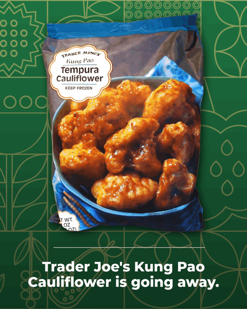 Say goodbye to another Trader Joe’s fan favorite. Their Kung Pao Tempura Cauliflower is officially being discontinued. This spicy, sticky, vegan-friendly frozen meal has been a fan-favorite since it hit freezers years ago, so this news has left loyal shoppers frustrated (and stocking up while they can).