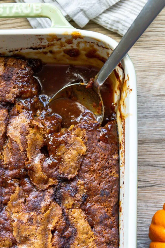 - Flour, sugar, and baking soda to create a light, fluffy cake texture. This recipe uses baking soda instead of baking powder because the batter includes acidic ingredients (brown sugar and pumpkin). Baking soda reacts with that acid to create carbon dioxide bubbles, which helps the cake rise and stay tender without over-leavening. Baking powder already contains both an acid and a base, so it reacts twice (once when wet and again in the oven) which would make a pudding cake rise too much and lose its dense, saucy texture.