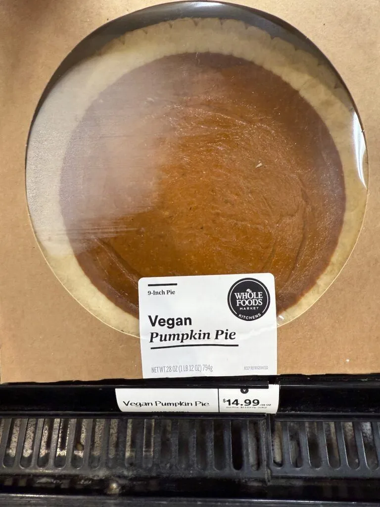 Whole Foods Market has their own Vegan Pumpkin Pie in the bakery section and some stores may have Wholly Wholesome Dairy-Free Pumpkin Pies in the freezer aisle. The Whole Foods bakery pumpkin pie has not gotten great reviews since changing their recipe a few years ago and I don’t know if that’s changed for 2025 so it’s possible they might let you sample it if you ask nicely at the bakery. The in-house pies may also be available for grab and go but can also be ordered from their holiday catering menu online or in-store to guarantee you’ll get it for the holidays.