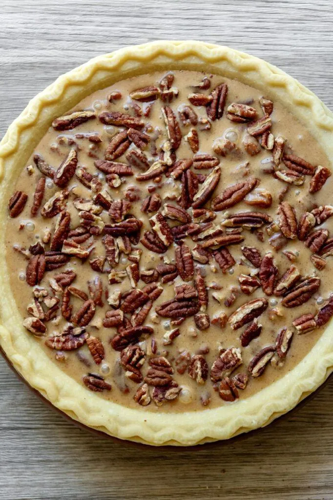 Watch closely checking every 5-10 minutes after about 40 minutes in the oven and cover the edges of the crust if browning too quickly but at around 50 minutes, the center will jiggle (like soft gelatin), the edges will be browning and pecans starting to color. At around the hour mark, bubbling may appear mostly across the entire surface with the exception of the center. You still want the center to jiggle a little so bake the full 65 minutes or even longer if it seems too loose. You don’t want the center fully set but not a very loose jiggle either. It’s a fine line, but err on the side of more doneness than less. I baked mine for the full 65 minutes in a convection oven which uses air which usually bakes things faster but as all ovens vary, yours may need to bake more time or less so keep a close watch and check in five minute intervals after the full bake time if you feel it needs to bake a bit longer. Baking a bit under or over is normal for any recipe especially one with a longer bake time.