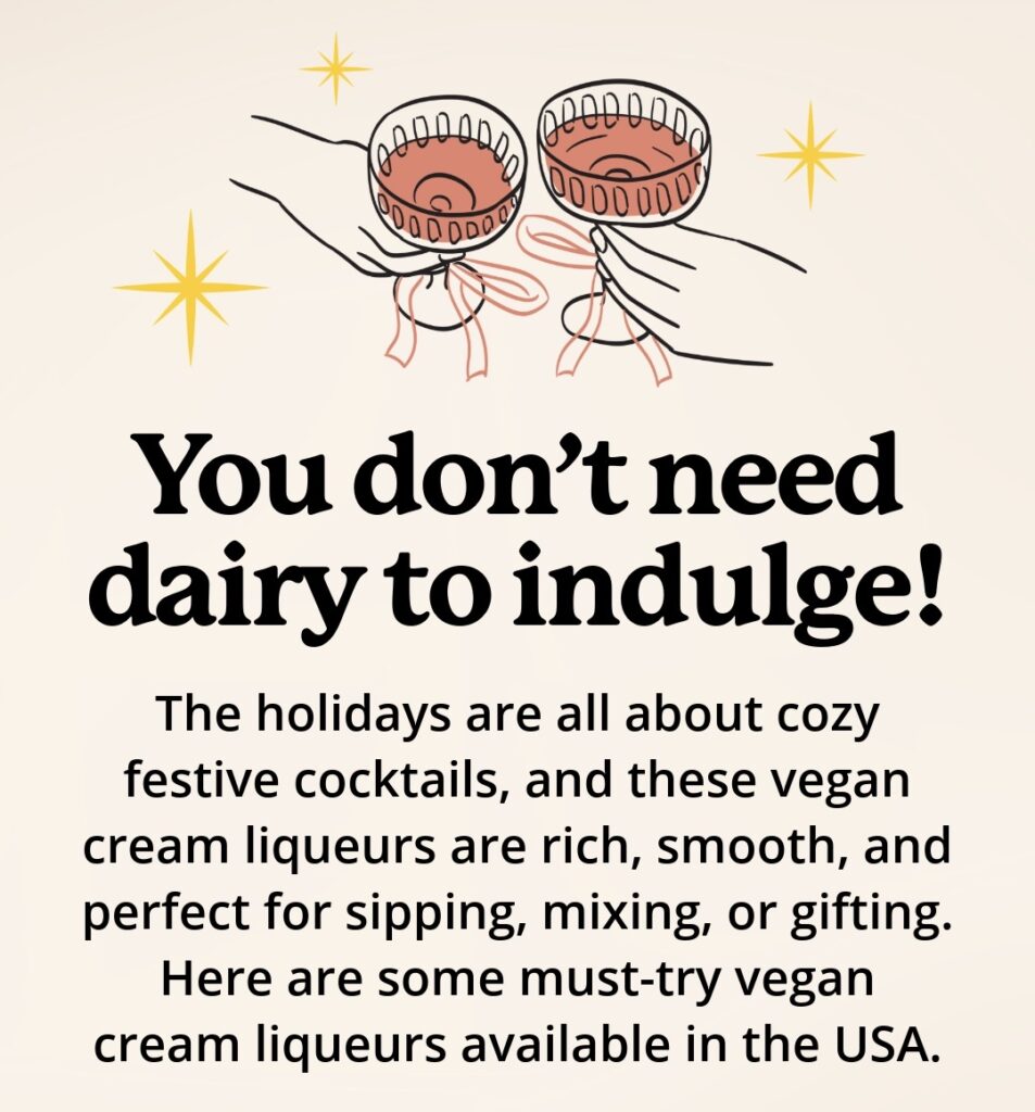 The holidays can often be about cozy drinks, festive cocktails, and dessert-inspired libations for some and now, you don’t need dairy to indulge. Vegan cream (crème) liqueurs are rich, smooth, and perfect for sipping, mixing, or gifting. Here are some must-try vegan cream liqueurs available in the USA if you enjoy a holiday tipple. Click on the image or “where to buy” header to hopefully find them near you.
