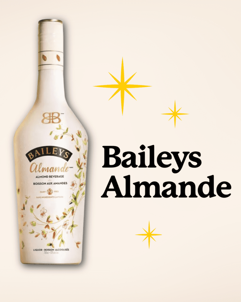 Baileys Almande is Baileys’ iconic dairy-free version, offering a smooth almond-milk base with hints of vanilla. It’s perfect for Irish coffee–style cocktails, dessert drinks, or sipping over ice.