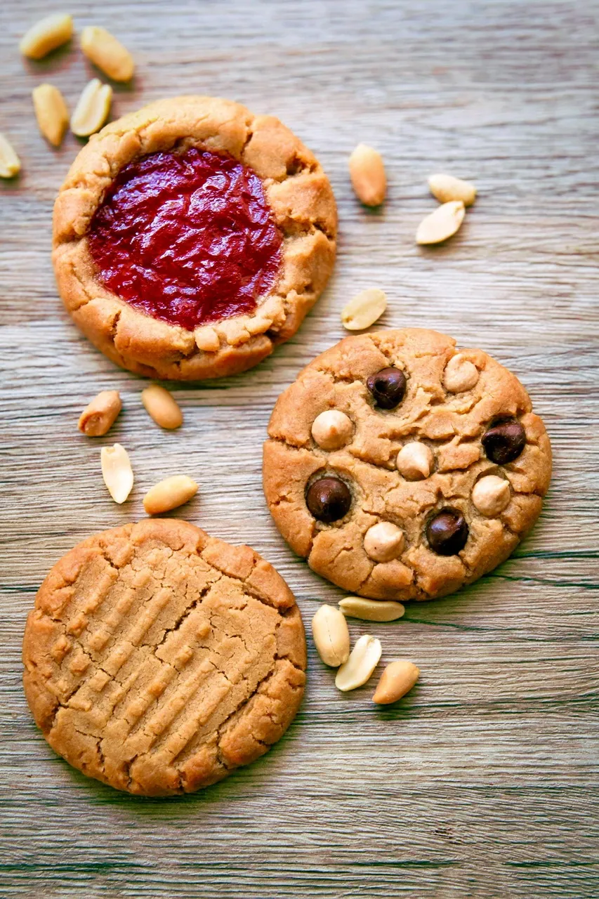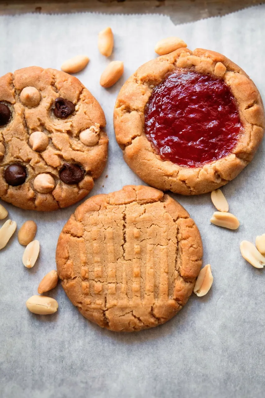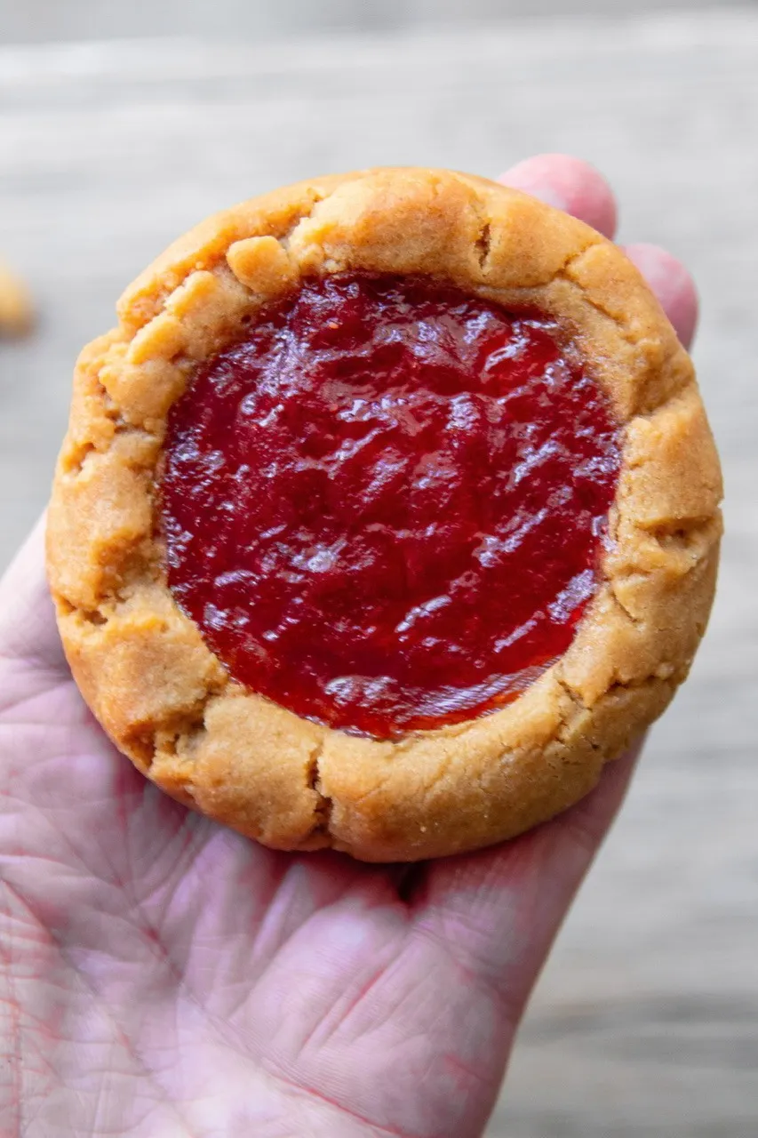 - Jam-topped thumbprint style peanut butter cookies.