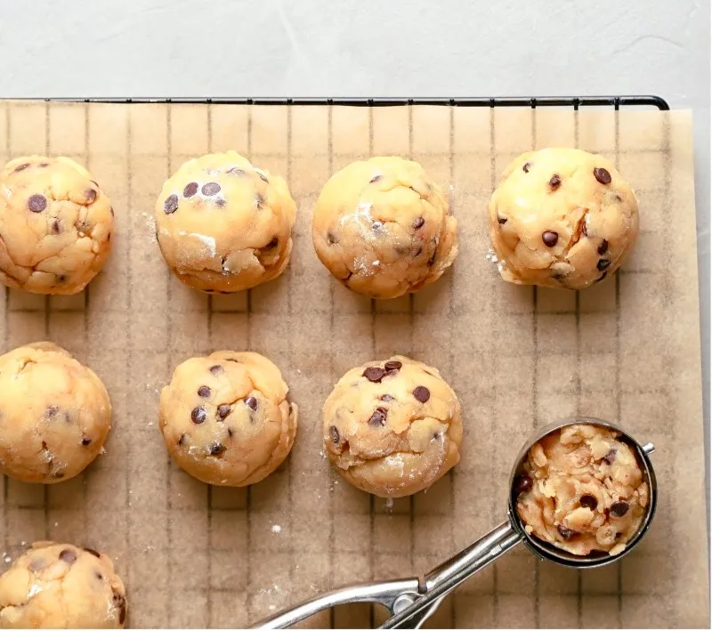 Pro Tip: Always bake one test cookie first. Scoop size, dough temperature, humidity, and oven calibration can all affect final bake time, and cookies should look set around the edges but still soft in the center when removed from the oven.