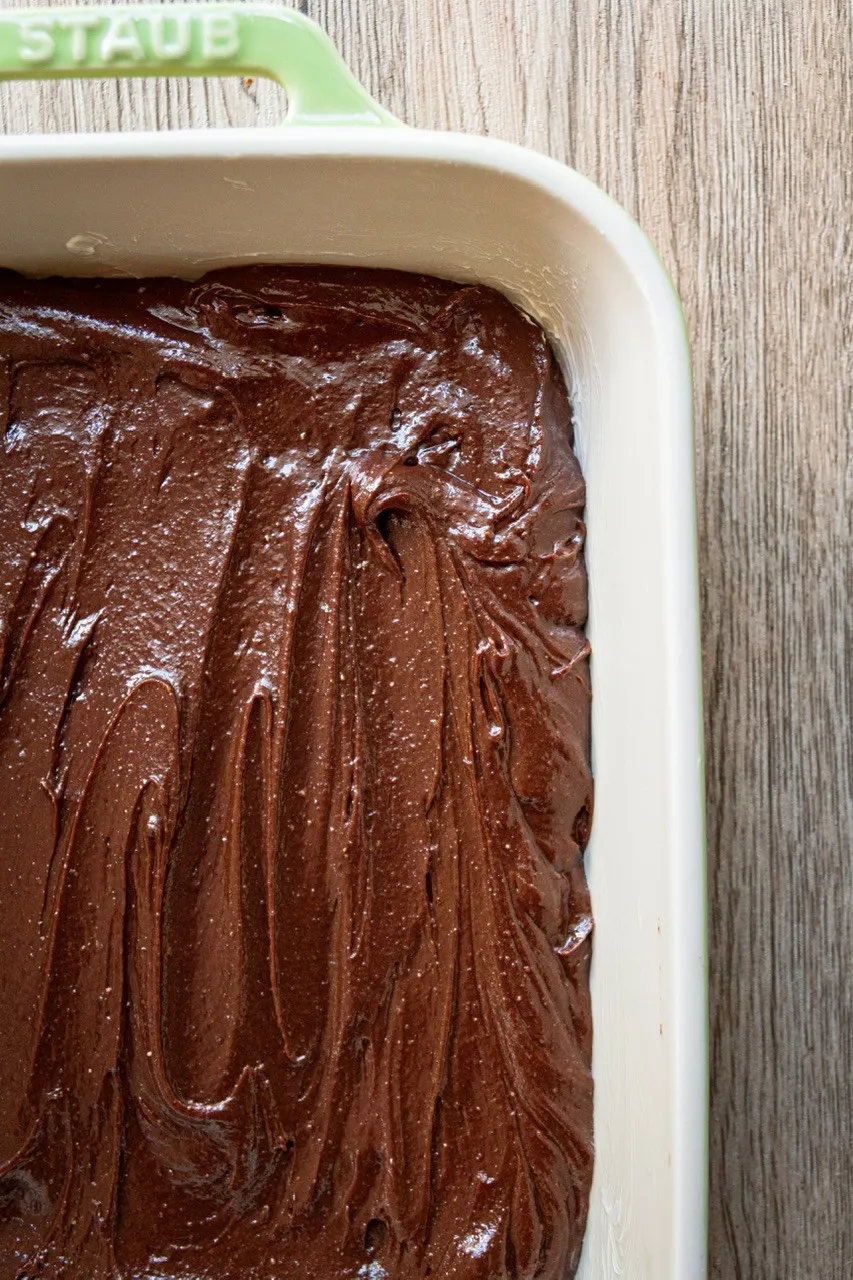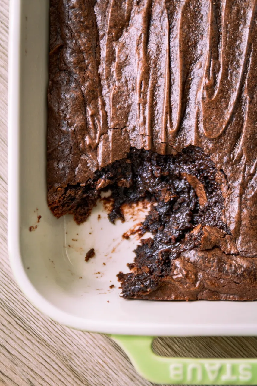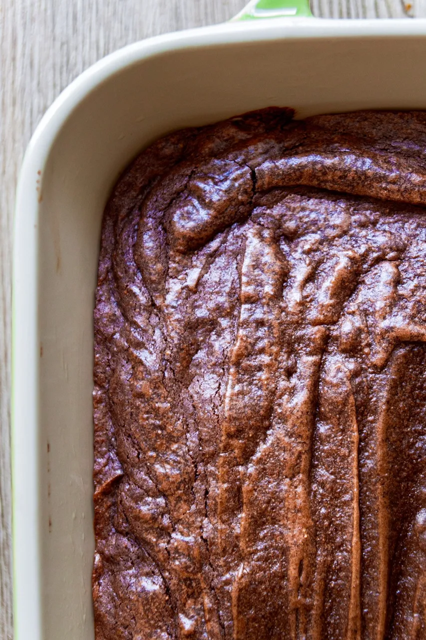 The original brownie pudding gets its thicker crust largely from eggs. This vegan version doesn’t replicate that exact egg-based structure, but it does develop a real, noticeable crust.