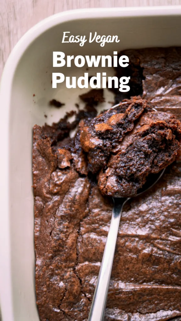 This brownie pudding is best served warm, scooped straight from the dish. It’s great on its own, or with vegan ice cream, whipped cream, or a drizzle of chocolate sauce.