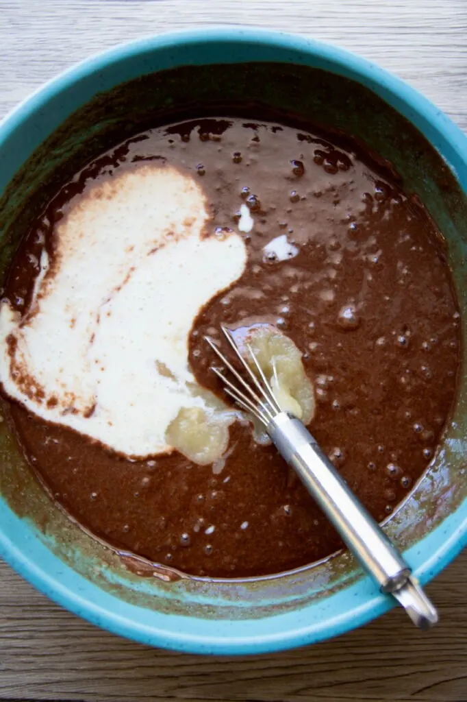 • Whisk in the applesauce, vanilla, and prepared vegan buttermilk. The batter will be thin and pourable. This is normal. Pour the batter into the prepared pan and gently level it.