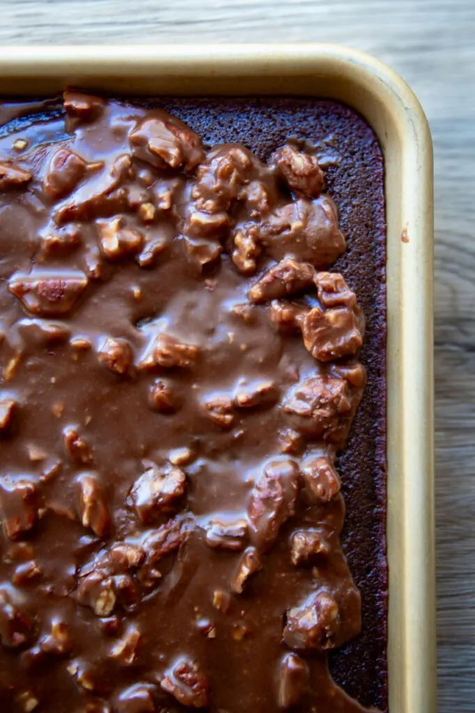 Texas sheet cake is a large, thin chocolate cake traditionally baked in a rimmed sheet pan and finished with a cooked chocolate icing with pecans that is poured over the cake while it is still warm.