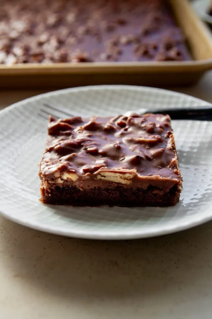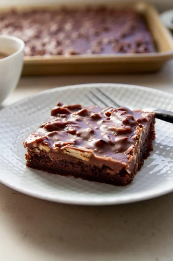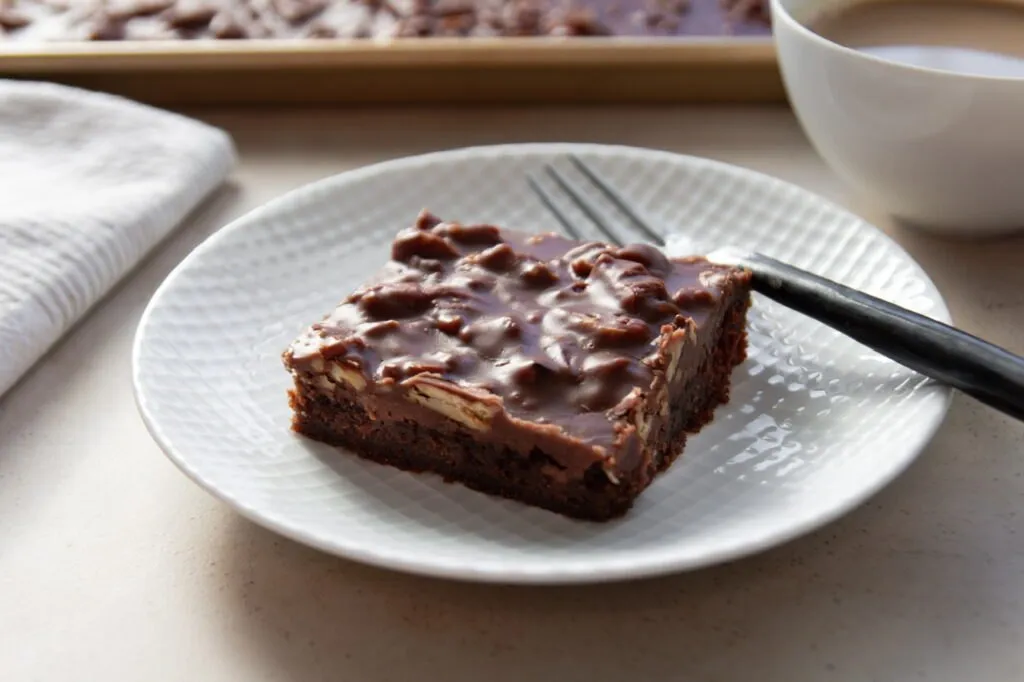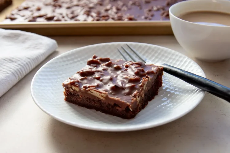 Traditional Texas sheet cake I’ve found should be thin, baked quickly, and iced warm. Many modern recipes drift away from this by making it thicker, sweeter, or more like a standard chocolate cake baked in a large pan but my recipe intentionally goes back to the original style.