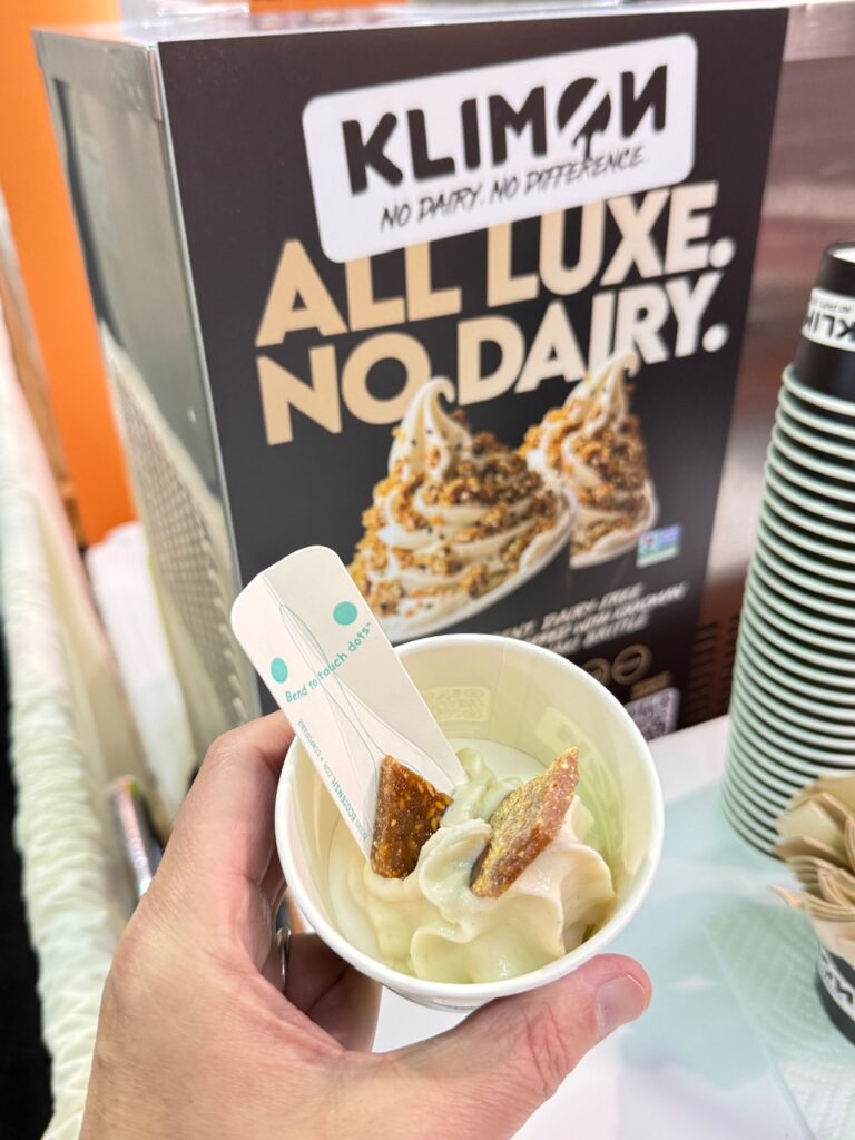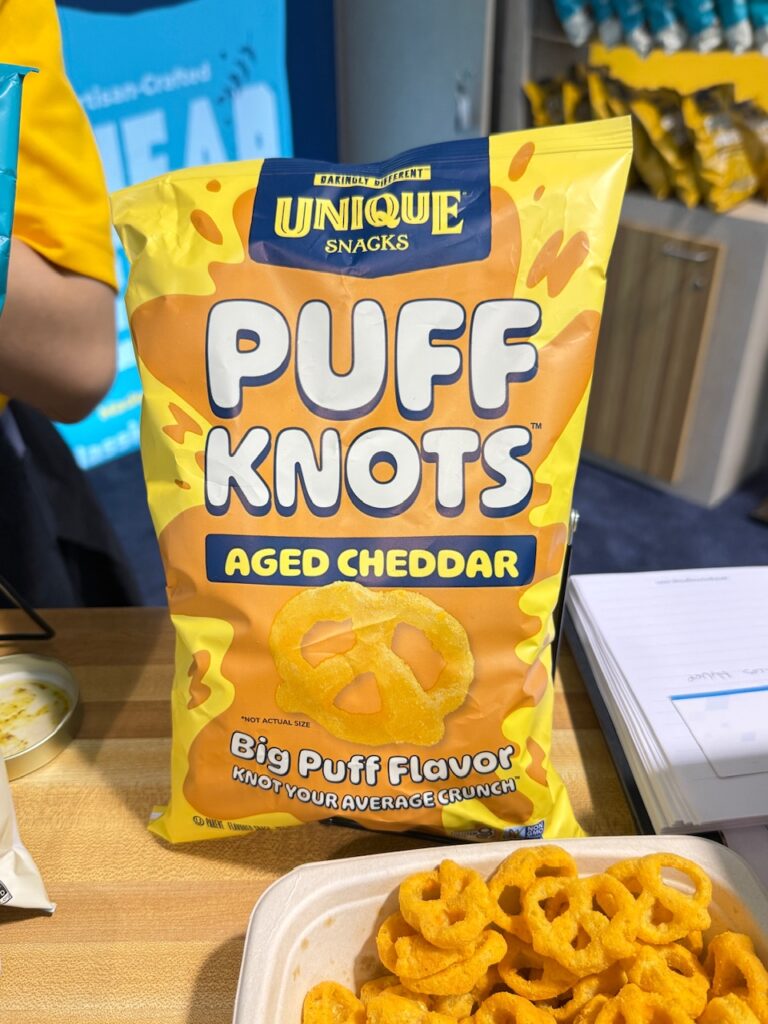 An interesting pairing came from Klimon and Kikkoman where they served vanilla soft serve with a candy sesame brittle that was seriously delicious. Wayfare debuted new vegan block butters in two flavors that seem to be first of their kind: cinnamon and garlic herb. Unique brand has rebranded their Puffzels to Puff Knots, and Esti had new overnight oats on display.