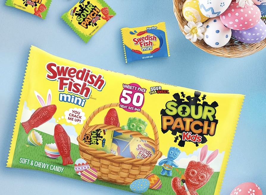 Annie’s Organic Bunny Grahams in Neapolitan are a bestseller for good reason and one of the easiest basket fillers you’ll find. I found a large bag at my local Costco recently. For Noshers Only makes peanut butter bites dipped in chocolate that are dairy free and great for snacking (they look like the ones Trader Joe’s sells). Free2b has their Basket O’ Yummies sunflower butter sun cups back (20 cups, allergy friendly, and a good nut-free option). SmartSweets Berry Bunnies are back in limited edition Easter packaging with 3g of sugar per bag. Easter candy bracelets are always a hit if you’re building a basket for kids, and the Easter lollipop collection with vegan chocolate lollipops is a simple but solid stuffer. Sour Patch Kids Bunnies, the Swedish Fish and Sour Patch variety pack, and Smarties Easter rolls round out the filler category and are vegan friendly and easy to find.
