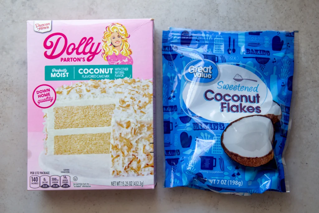 I use my Better Boxed Vegan Cake recipe here, which upgrades a standard boxed cake mix with a few simple swaps that make the crumb richer and more tender with no need for eggs. My cake mix of choice is Duncan Hines Dolly Parton’s Coconut Cake flavor, which is accidentally vegan like most commercial cake mixes and brings a solid coconut flavor right from the start. You can find it at Walmart and lots of regional retailers.